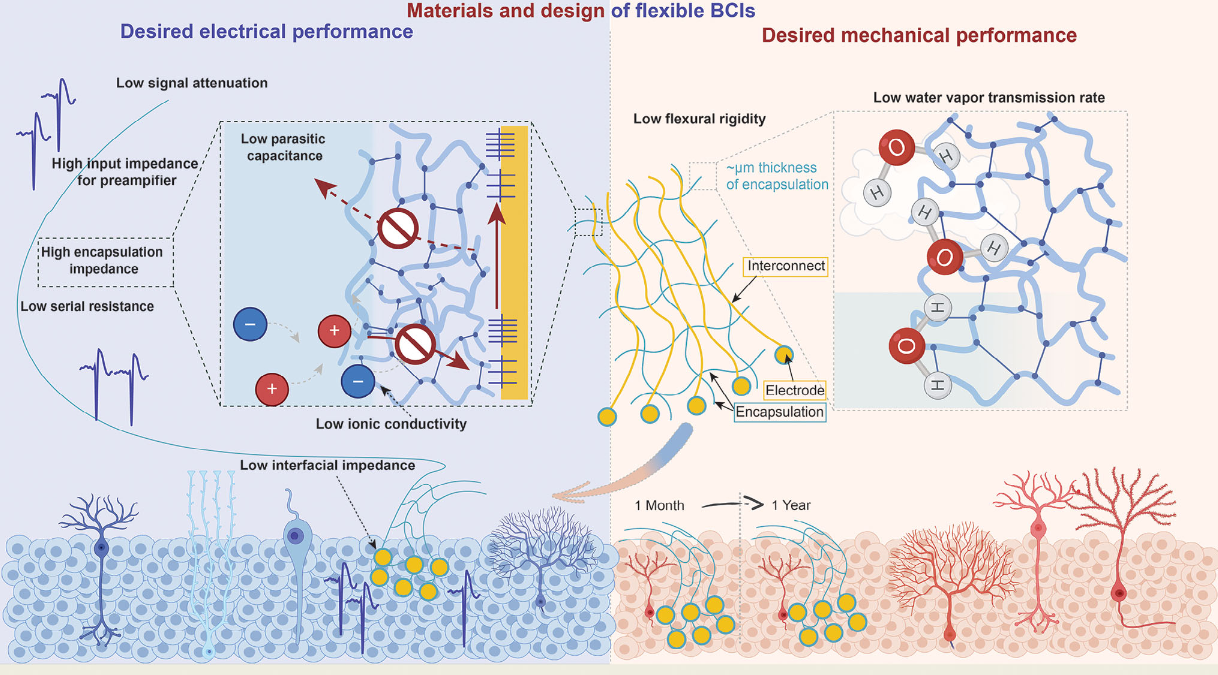 We examines the selection of materials and device design for flexible BCIs.